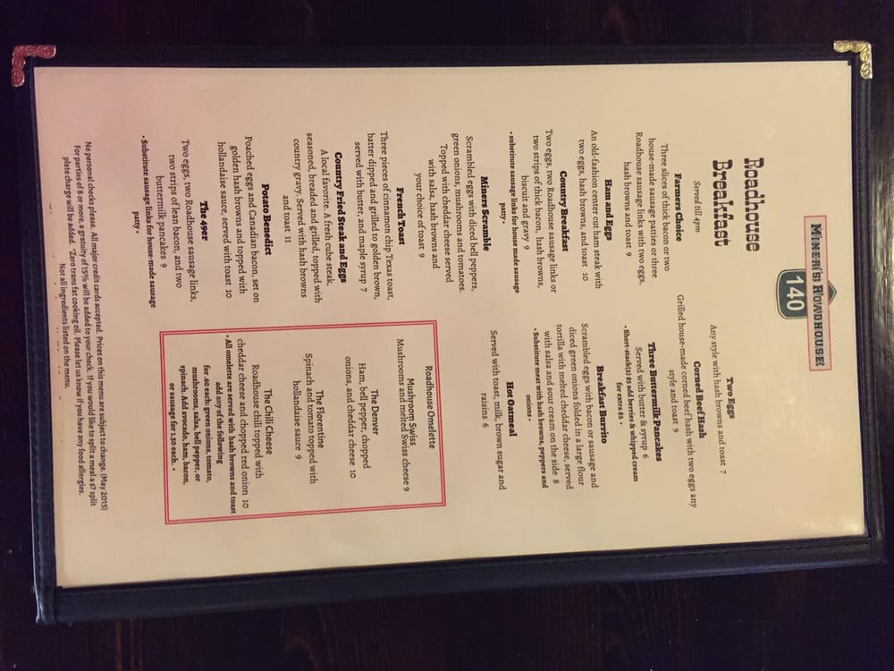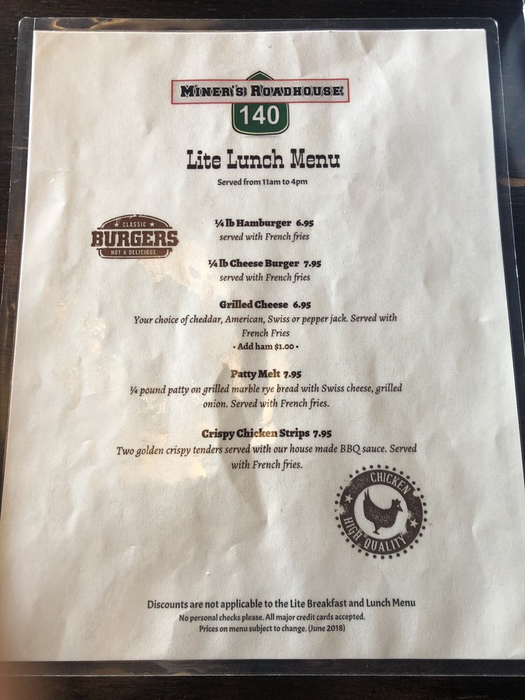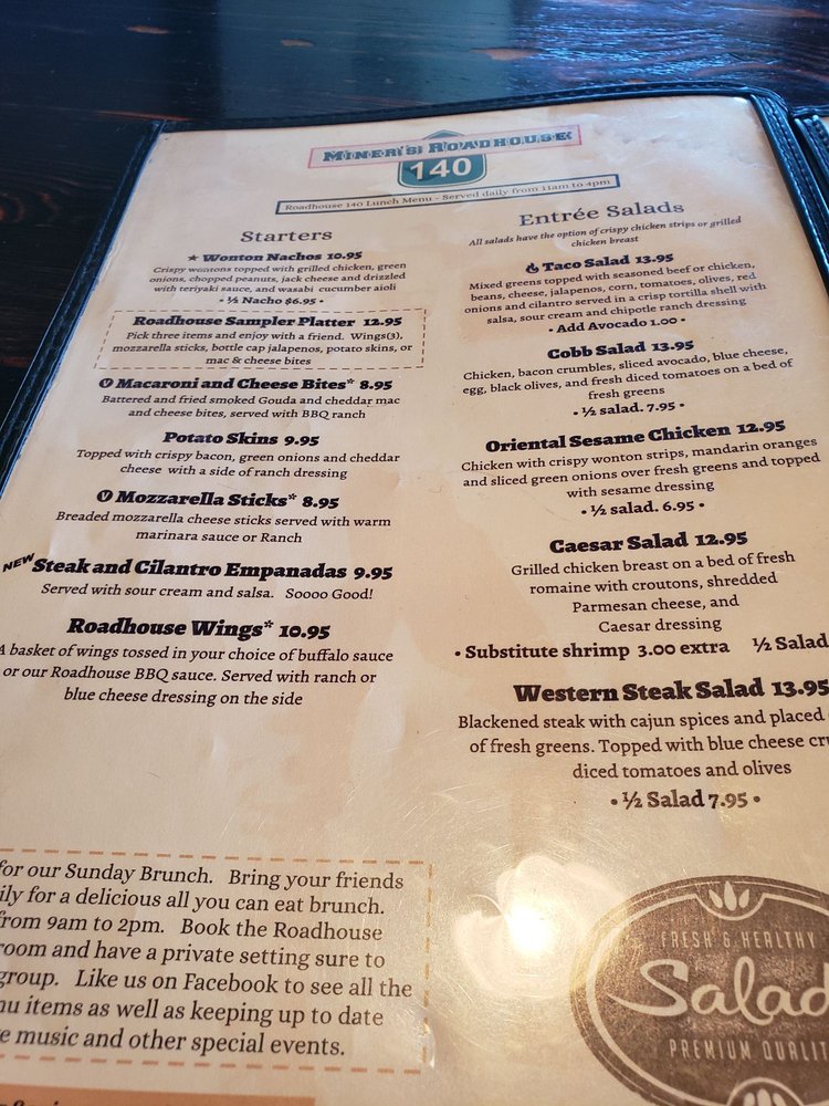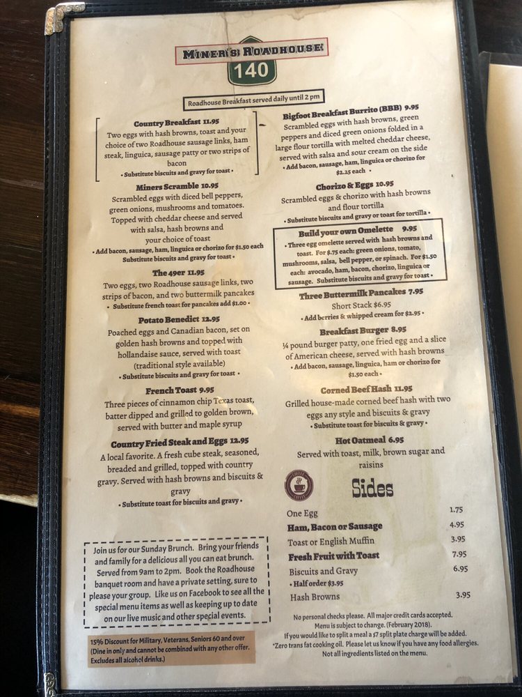 Discover the rustic charm of Miner’s Roadhouse 140 located in Mariposa, CA. This casual eatery offers a diverse menu with many vegetarian options, perfect for breakfast, brunch, and lunch. The cozy atmosphere and friendly staff create a welcoming dining experience. From delectable sampler platters to mouth-watering Hamburger Steak, each dish is prepared with care and offers a taste of traditional, satisfying American cuisine. Don't miss out on the fluffy pancakes, delicious sausage, and perfectly cooked French toast. With convenient amenities like free Wi-Fi, full bar, outdoor seating, and a private parking lot, Miner’s Roadhouse 140 is a great choice for groups, families, and solo diners alike. Next time you're in the area, stop by for a satisfying meal and a taste of true hospitality.